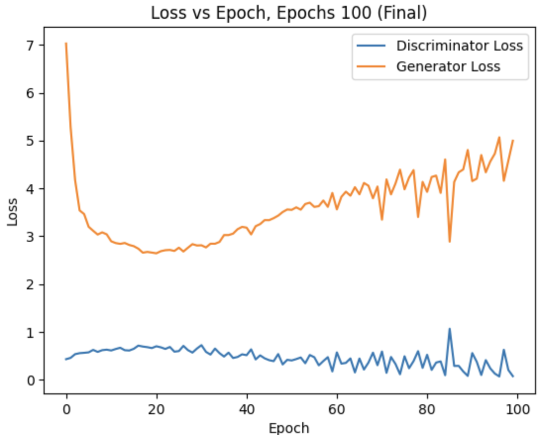 - Epochs When testing it was discovered that models with loss curves that remain at an 'equilibrium' of sort for a number of epochs tended to perform better when simply trained for longer. As the network is adverserial, the loss is no real indication of overall performance as the Generator and Discriminator can improve at the same rate. The network was trained for 20, 50 and 100 epochs, demonstrating overall improved image generation after longer training. Analysing loss curves showed that going for too long resulted in overfitting as the Discriminator slowly learned all the images in the dataset, naturally making it discriminate more efficiently.