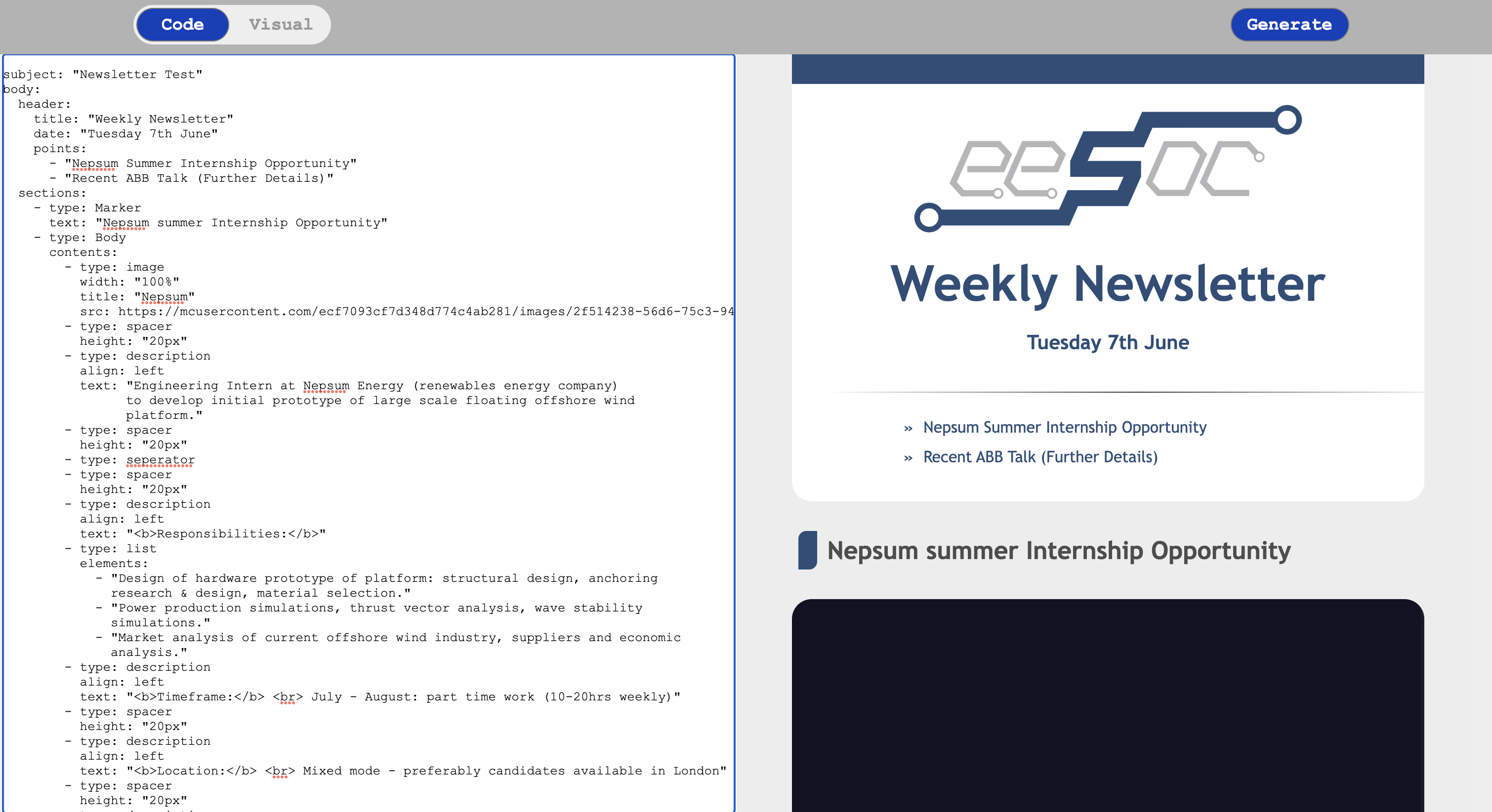 - Specification Based Generation A YAML specification is used to fill out a Jinja2 HTML email template creating a structured and simple approach to email writing. Using this reduced the time it took to write a new newsletter from an hour to just 10 minutes.